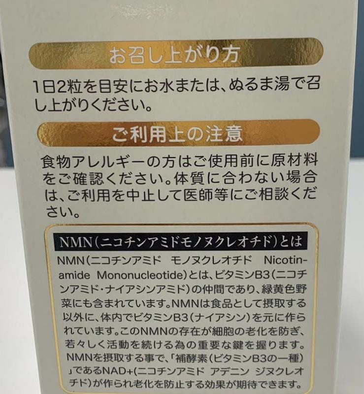 By ingesting NMN, NAD+ (nicotinamide adenine dinucleotide), a “coenzyme (a type of vitamin B3)” is produced, which is expected to play a role in preventing aging.